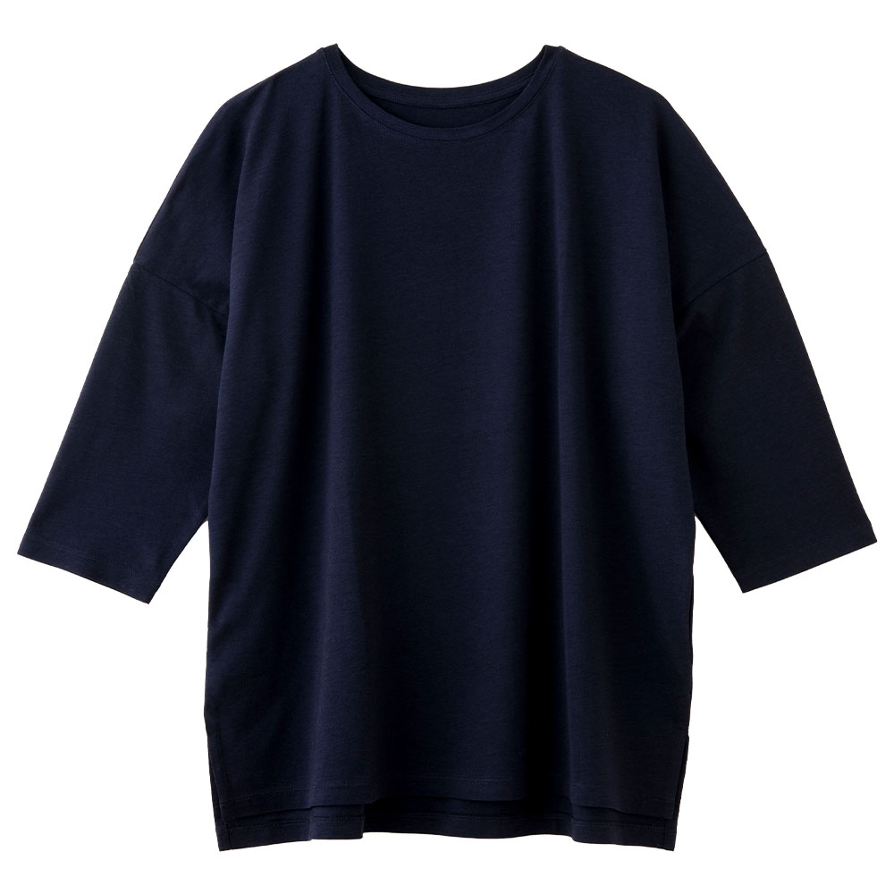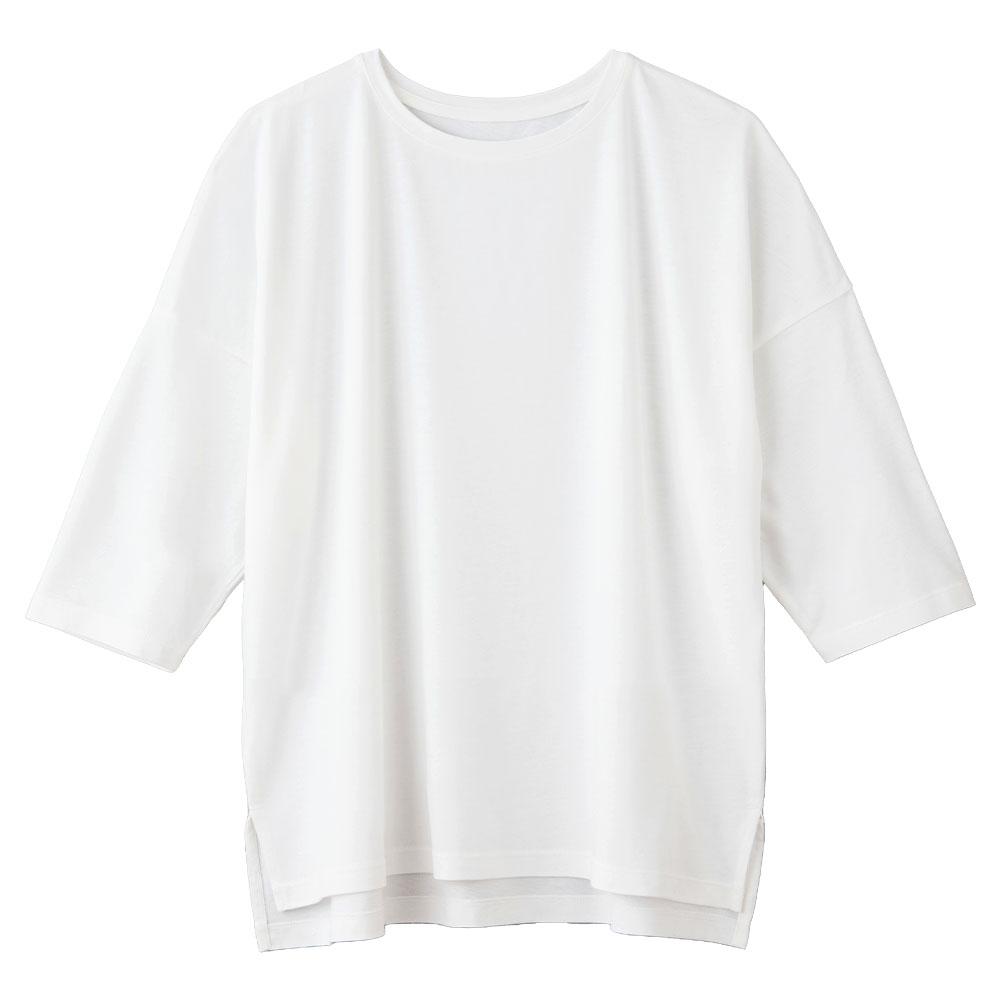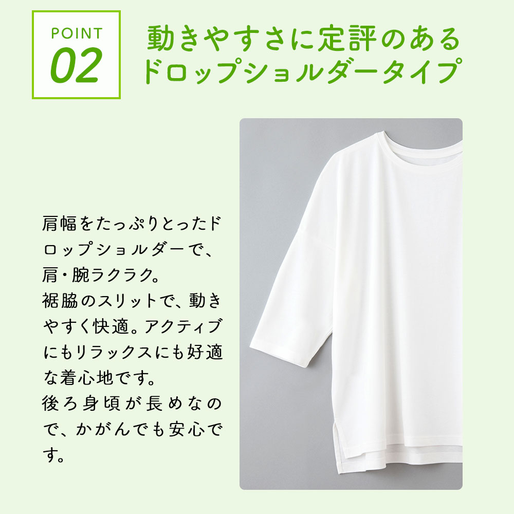 肩幅をたっぷりとったドロップショルダーで、肩・腕ラクラク。 裾脇のスリットで、動きやすく快適。アクティブにもリラックスにも好適な着心地です。
