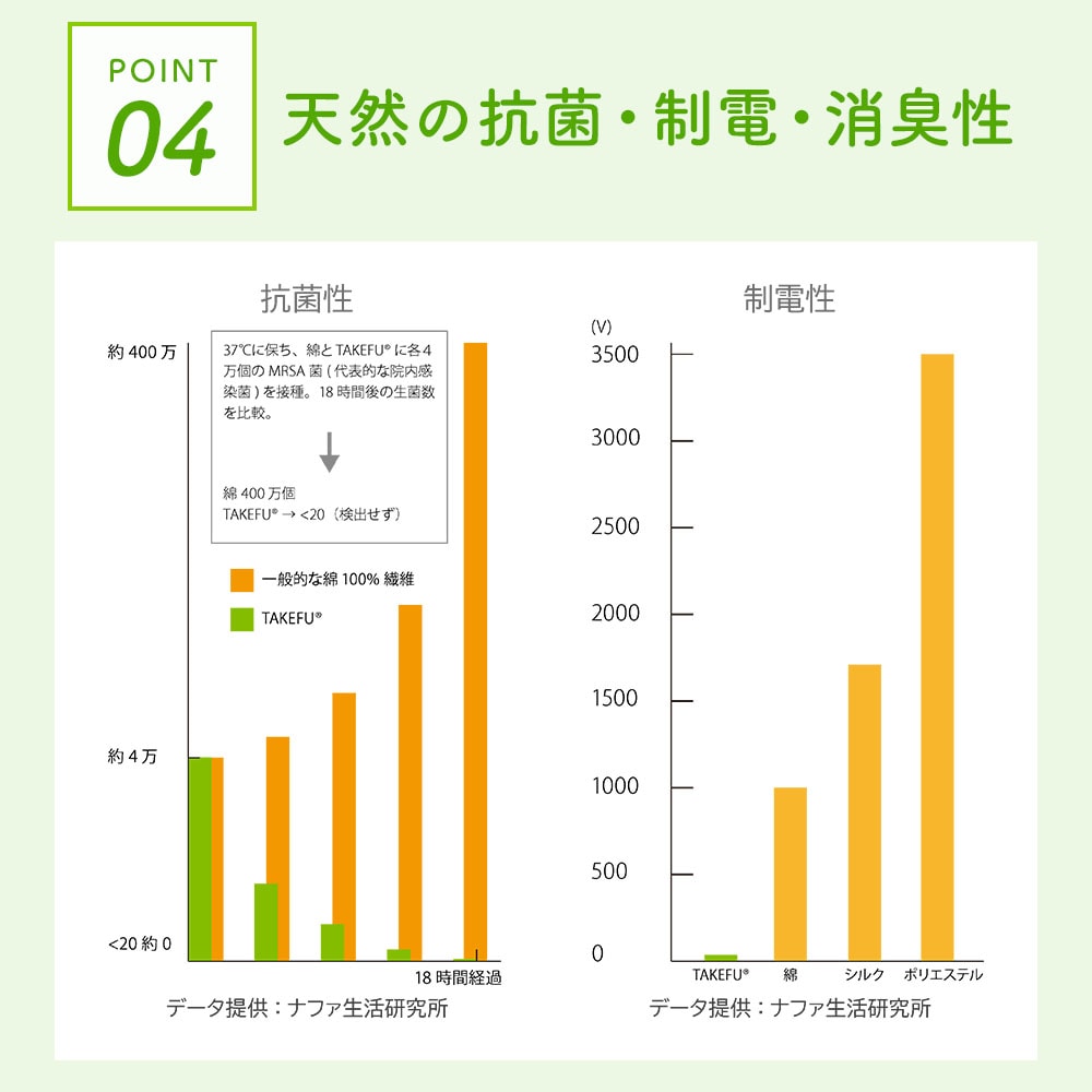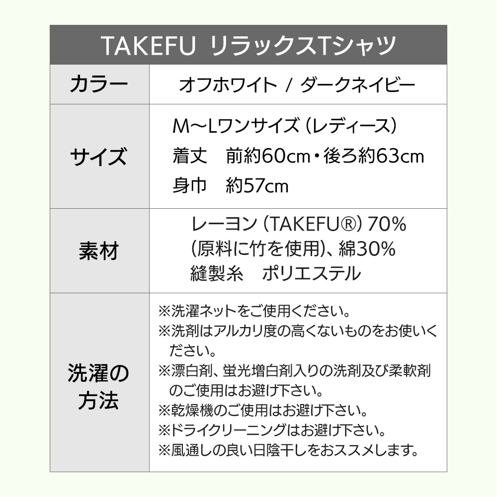 ※TAKEFU®は、竹原料100%で作られた再生セルロース繊維(レーヨン)で、(株)ナファ生活研究所が所有する登録商標です。レーヨンとは木や竹などの植物から作られる繊維で、石油を原料とする合成繊維とは異なります。
