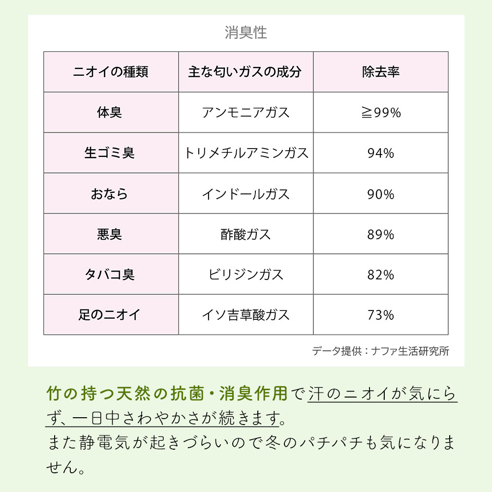 竹の持つ天然の抗菌・消臭作用で汗のニオイが気にらず、一日中さわやかさが続きます。 また静電気が起きづらいので冬のパチパチも気になりません。