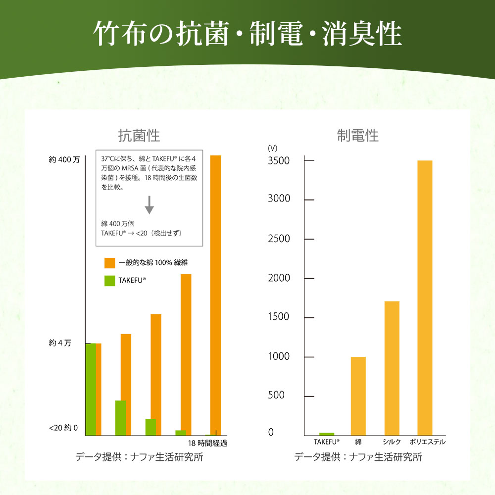 ※TAKEFU®は、竹原料100%で作られた再生セルロース繊維(レーヨン)で、(株)ナファ生活研究所が所有する登録商標です。レーヨンとは木や竹などの植物から作られる繊維で、石油を原料とする合成繊維とは異なります。