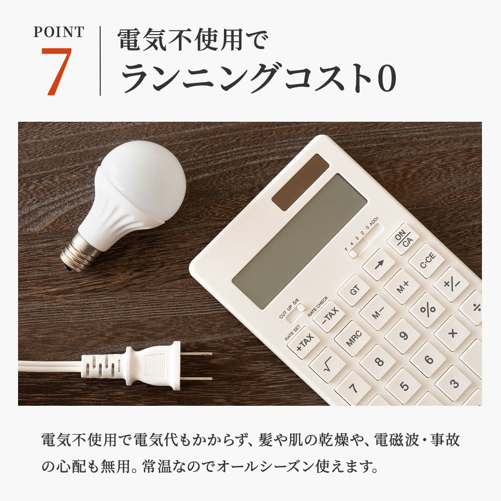 電気不使用で電気代もかからず、髪や肌の乾燥や、電磁波・事故の心配も無用。常温なのでオールシーズン使えます。