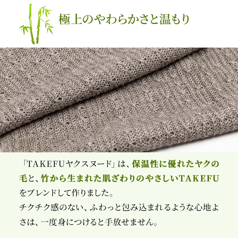 「TAKEFUヤク スヌード」は、保温性に優れたヤクの毛と、竹から生まれた肌ざわりのやさしいTAKEFUをブレンドして作りました。
