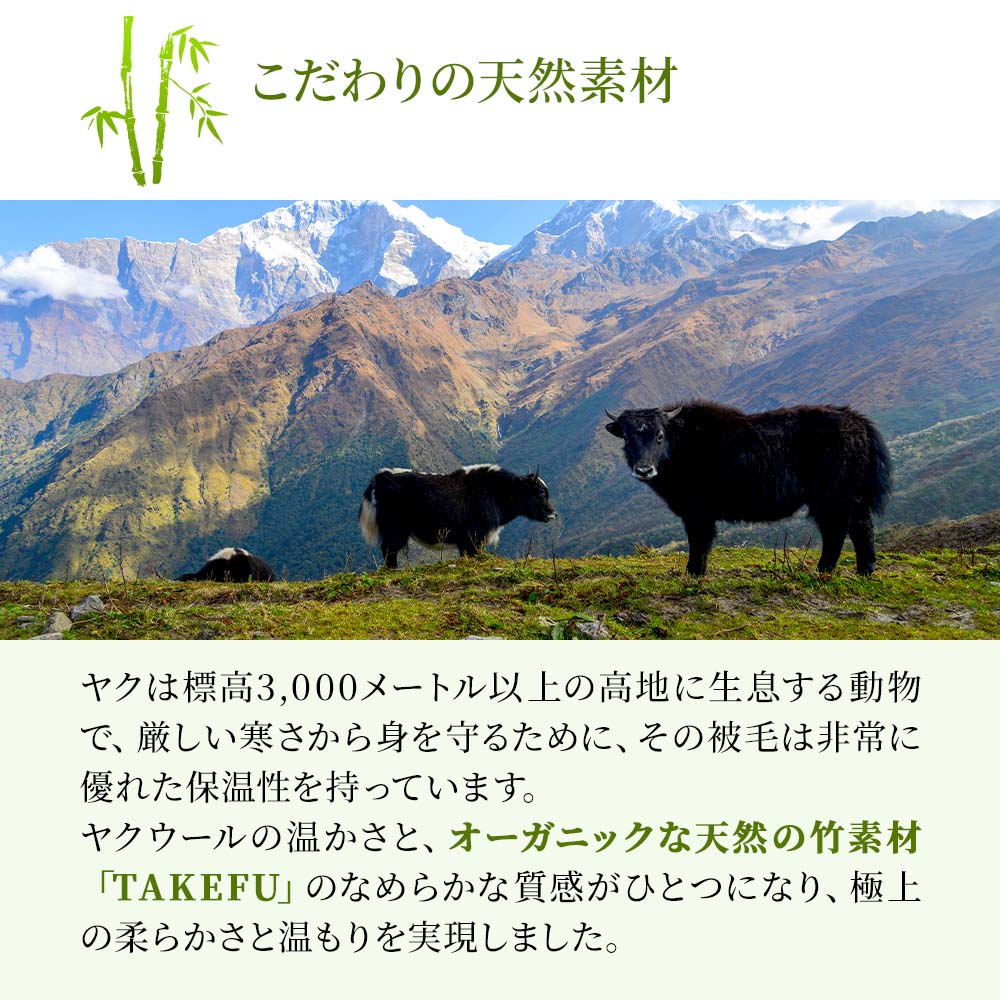 ヤクウールの温かさと、オーガニックな天然の竹素材「TAKEFU」のなめらかな質感がひとつになり、極上の柔らかさと温もりを実現しました。